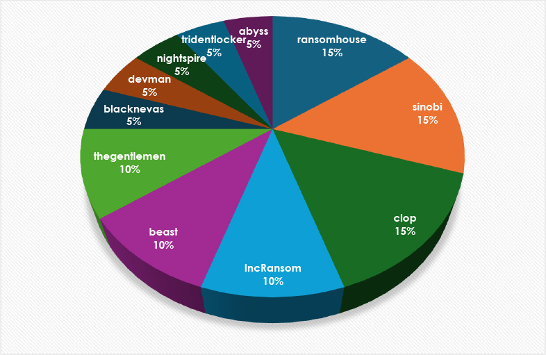 A second tier of activity is formed by IncRansom, Beast, and TheGentlemen, each contributing roughly 10% of observed cases. These actors appear active but less dominant, indicating either narrower targeting strategies or shorter campaign cycles compared to the leading groups.