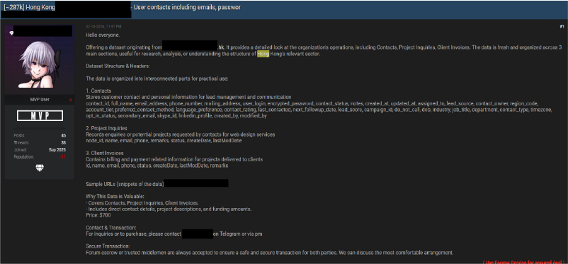 Entities in Hong Kong continued to be disproportionately targeted by threat actors operating on underground forums and dark web marketplaces. Our monitoring identified numerous underground posts, data sales, and breached database advertisements specifically targeting organizations in Hong Kong across financial, government, telecom, and industrial sectors. The prevalence of Hong Kong-specific data sales, combined with active discussions among cybercriminals regarding exploitation techniques targeting local infrastructure, indicates sustained interest in the region as a high-priority target. The following analysis details the types of data being traded, threat actor activity patterns, and strategic implications for Hong Kong organizations.