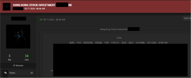 On Feb 11, 2026, an underground forum post under the title “Hong Kong Stock Investment.” The post appears to promote or share stock-related information, potentially including stock codes and trading details. The user profile section highlights community engagement through displayed reputation points, likes, and total posts. The main content area suggests that stock data or investment insights are being discussed.