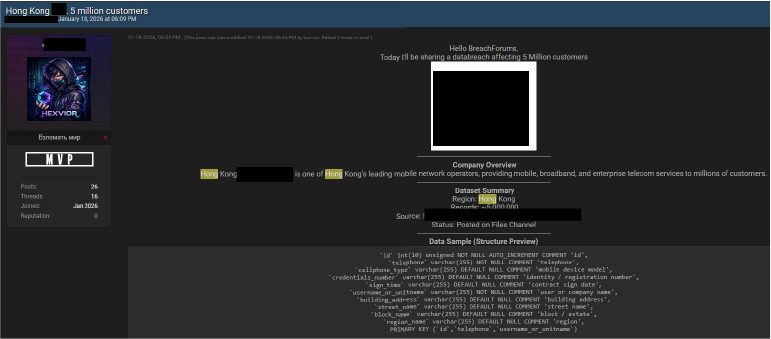 On Jan 18, 2026, a post in an underground forum advertised an alleged data breach involving a Hong Kong-based telecom provider, claiming exposure of approximately 5 million customer records. The seller states the data originates from a mobile communications subscriber database and includes fields such as ID numbers, phone numbers, usernames, email addresses, contract details, and address information. The breach is presented as recently posted and available via a file channel, with a sample database structure shown to demonstrate the scope of compromised information.