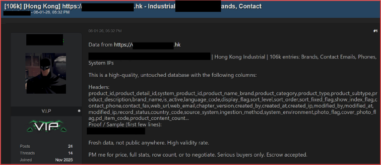 On Jan 6, 2026, a threat actor advertised the sale of a Hong Kong-based industrial product database. The post claims the dataset contains approximately 106,000 entries, including brand names, contact emails, phone numbers, system IPs, and detailed product-related metadata (e.g., product categories, descriptions, images, and timestamps). The seller describes the data as “fresh” and not publicly available, offering samples upon request and accepting escrow payments. If authentic, the dataset could expose sensitive business information and increase the risk of phishing, business email compromise (BEC), supply chain targeting, and corporate reconnaissance against affected Hong Kong industrial entities.