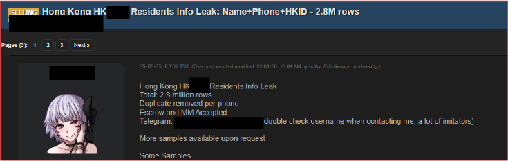 On Aug 25, 2025, a threat actor is advertising the sale of a Hong Kong residents’ database on a cybercrime forum. The post claims the dataset contains approximately 2.8 million records, including names, phone numbers, and HKID details. The seller states that duplicate entries have been removed based on phone numbers and offers escrow payment options. Sample data is reportedly available upon request, with contact directed via Telegram.