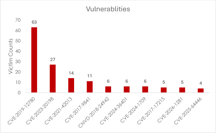 Unpatched VPN appliances, firewall platforms, web applications, and exposed administrative interfaces remain high-risk entry points. WordPress environments, misconfigured enterprise services, and outdated firmware across network devices were frequently observed as exposure points.