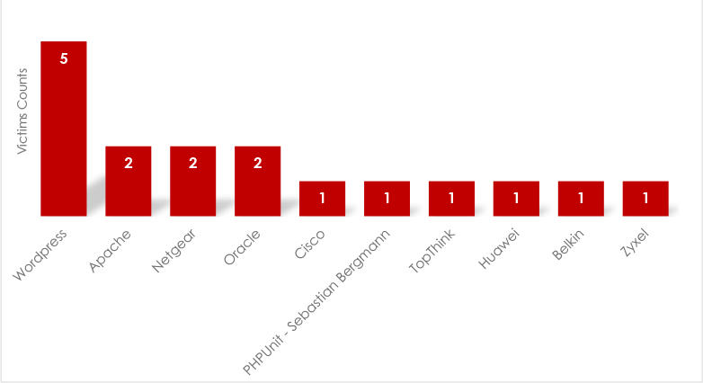 WordPress appears as the most frequently exploited platform, primarily due to vulnerable plugins, outdated installations, and exposed administrative interfaces. A second tier includes Apache Software Foundation, Netgear, and Oracle Corporation, where misconfigured web services, unpatched vulnerabilities, and exposed enterprise applications provide initial access opportunities.