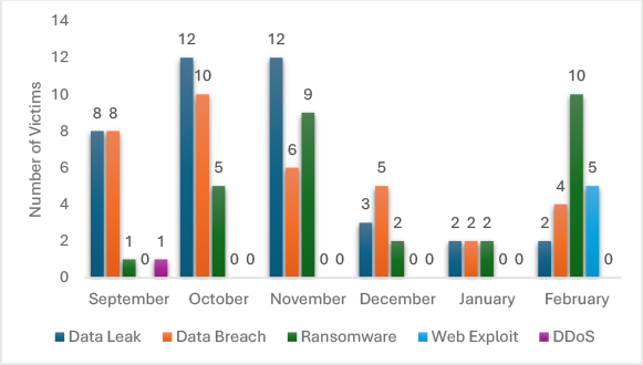 Web exploitation activity remains relatively moderate but becomes more visible in the later stage, indicating increased use of vulnerable web applications and exposed services as initial access vectors. Distributed denial-of-service (DDoS) activity appears minimal overall, suggesting it is used selectively, likely as a secondary pressure technique rather than a primary attack method.