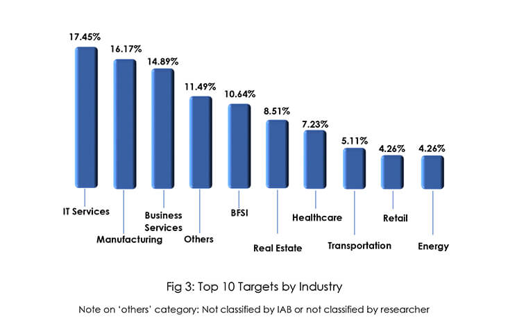 Our sample data analysis of the IAB ecosystem revealed that nearly half of victim organizations’ revenue is up to USD 10 million. Indicating that it is easier to compromise small organizations with limited budgets to implement strong cyber defenses than it is to compromise larger organizations with more revenue. Data from compromised victims of financially strong organizations demonstrate the sophistication of IABs as well as the fact that money alone cannot protect an organization from cyber-attacks.