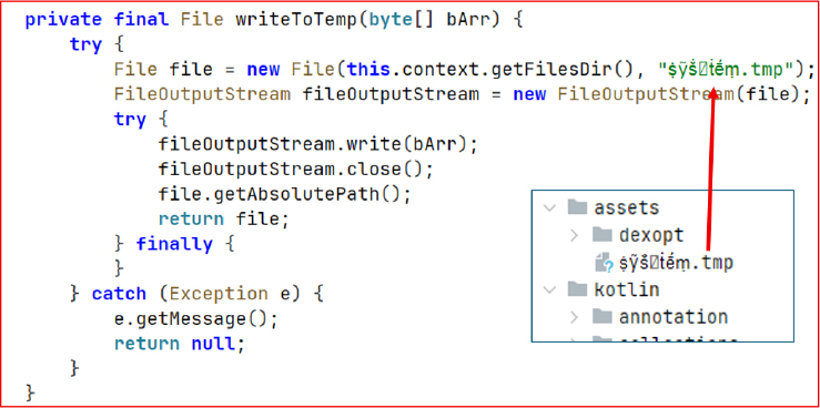 This function writes raw decrypted byte data into a temporary file stored inside the application’s private directory. The filename uses Unicode-based obfuscation (ṩỹṧ꙱ṫḗṃ.tmp), likely intended to reduce visibility during static inspection or manual analysis.