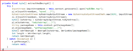 The file is fully loaded into memory and then decrypted using a key derived from the application package name. This ensures that the payload remains inaccessible unless executed within the correct application context.