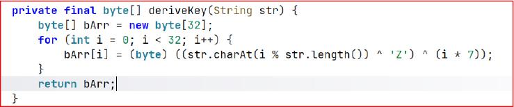 This function generates a 32-byte symmetric key using the application’s package name as the base input. The logic cycles through characters of the package name and transforms each byte using two fixed operations: an XOR with the character ‘Z’ and an additional position based XOR with (i * 7).