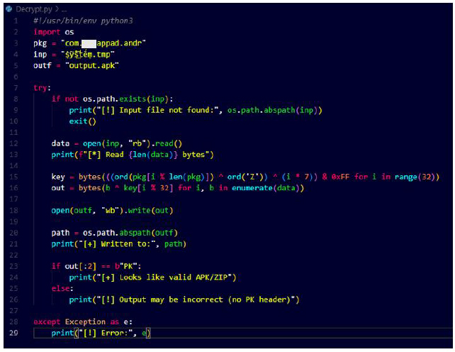 We reimplemented the same XOR decryption logic using the package name com.***appad.andr to regenerate the identical 32-byte key as produced by deriveKey() in the application. The same XOR routine was then applied to the encrypted asset, successfully reconstructing the original APK payload from the obfuscated data.
