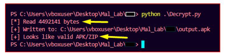 The output confirmed that the decrypted file is a valid APK/ZIP archive, indicated by the “PK” header signature. The final payload was successfully written as output.apk, with a size of approximately 4.49 MB.