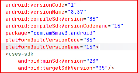 The decrypted and installed secondary payload is identified as com.am5maw3.android, with versionCode 1 and versionName 8.37. It is compiled against Android 15 (SDK 35) and targets modern Android devices with a minimum SDK level of 23.