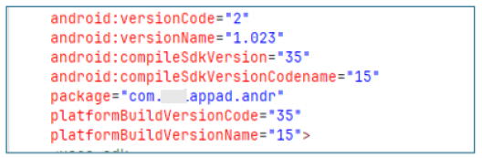 The application is packaged under the identifier com.***appad.andr with version code 2 and version name 1.023. It targets Android 15 (SDK 35), indicating compatibility with modern Android environments. On the surface level, the package naming does not align with any verified banking developer or official branding pattern.