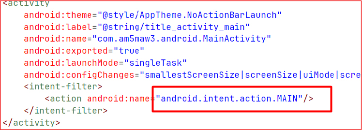 The application’s main activity is declared with the MAIN action but intentionally omits the LAUNCHER category. As a result, the application does not appear in the device’s app drawer or launcher interface, significantly reducing its visibility to the end user.