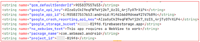 The application contains hardcoded Firebase credentials within strings.xml, including project_id, google_api_key, and google_app_id, indicating direct integration with a Firebase backend. These credentials point to an active project used for remote communication, enabling the application to receive commands and configuration updates from the backend.