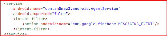 AgentService is declared in the AndroidManifest with the intent filter com.google.firebase.MESSAGING_EVENT, allowing it to receive and handle Firebase Cloud Messaging events. It acts as the primary entry point for processing incoming remote messages from the Firebase backend.