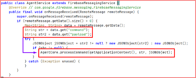 AgentService intercepts incoming Firebase message data, extracts the command and payload parameters, and forwards them to AgentCore.ProcessCommand, where the actual command execution and control logic is handled.