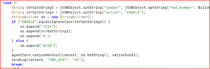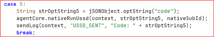 This block executes raw USSD codes received through the command payload. It reads the USSD string from the incoming JSON input and directly executes it using nativeRunUssd(context, code, nativeSubId). The executed command is then logged as USSD_SENT, confirming completion of the request.