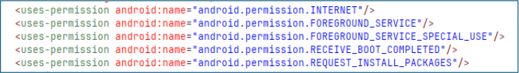 The app requests the REQUEST_INSTALL_PACKAGES permission, which grants it the ability to initiate installation of other APK files on the device. This stands out as a strong indicator of dropper behavior, where the primary application acts as a staging layer to deploy additional payloads after initial execution.