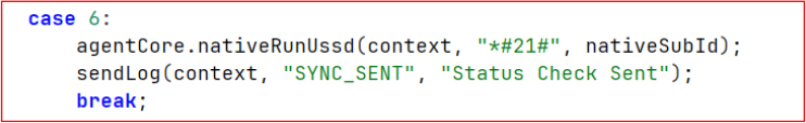 This block triggers a USSD query to check the current call forwarding status by executing *#21# through nativeRunUssd() on the active SIM slot. Once executed, it logs the event as SYNC_SENT | Status Check Sent, indicating the status request has been initiated and reported back through the logging channel.