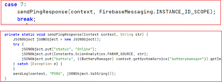The payload is then transmitted using sendLog(context, “PONG”, …), confirming that the device is active.