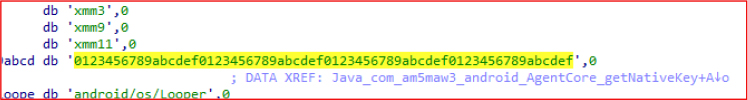 The getNativeKey function returns a repeated hexadecimal pattern in the form 0-f repeated four times. This key is used to encrypt data before sending it to the C2 server. The extracted value follows a uniform and predictable structure, indicating it is not a strong cryptographic secret but instead serves as a lightweight obfuscation key within the communication pipeline.