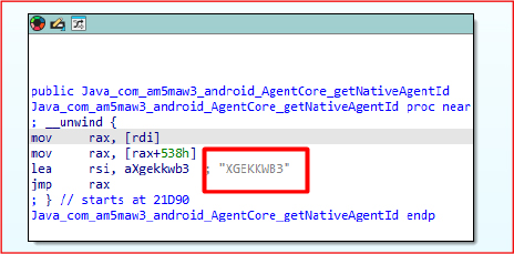 The function getNativeAgentId returns a hardcoded identifier in plain text extracted from the decompiled .so file: