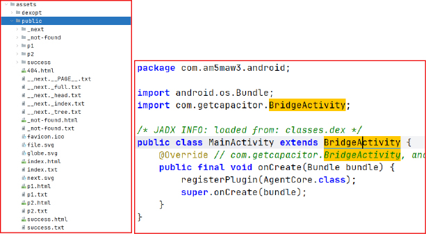 The application embeds a statically built Next.js frontend inside the assets directory, which is loaded into a Capacitor WebView at runtime. This web-based interface is used to render phishing content directly within the application UI.