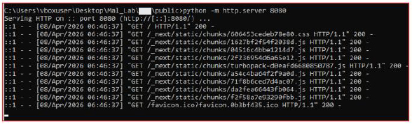 The exported Next.js public build is served via a local HTTP server to validate the rendered user interface. Once hosted, the application loads the web assets in a browser/WebView environment to confirm whether the phishing pages are correctly exposed and functioning as intended.