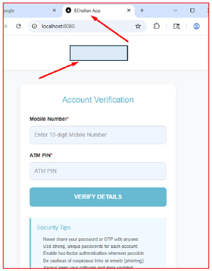 The page header identified itself as “EChallan app”, indicating reuse of a known phishing theme commonly associated with eChallan-related fraud campaigns targeting financial credentials.