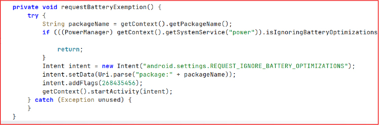 The requestBatteryExemption() method triggers a system prompt to request exclusion from Android battery optimization policies. This allows the application to remain active in the background without being restricted by Doze mode or power-saving limitations, ensuring persistent execution and uninterrupted background operations.
