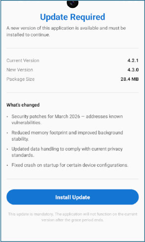 Upon installation and launch, the application displays a fake ‘Update Required’ interface that mimics a legitimate app update prompt. The UI is designed to appear as a mandatory update screen with a single action button labeled “Install Update”.