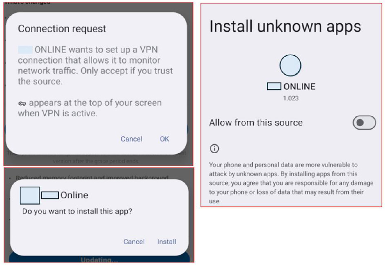 Upon clicking “Install Update”, the application requests a VPN connection prompt. Once the request is accepted, network connectivity is effectively disrupted. The application then prompts for the “Install unknown apps” permission, which is used to install the secondary payload APK.