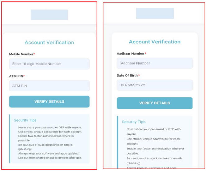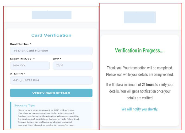 Upon serving the exported Next.js build on port 8080, the application rendered a phishing interface designed to mimic a legitimate banking KYC workflow. The UI prompted users to enter sensitive information such as mobile number and ATM PIN under the guise of “account verification”.