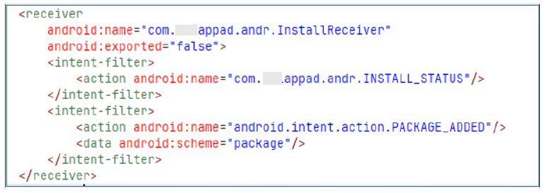 The app includes a non-exported receiver, InstallReceiver, that listens for installation events such as PACKAGE_ADDED and a custom install status action. This enables it to detect when applications are installed, confirming successful malware deployment and taking steps to prevent reinstallation or interference.