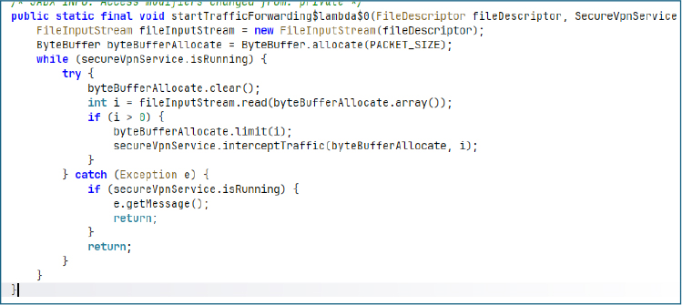 Inside the VPN service, a continuous processing loop handles incoming and outgoing network packets in real time. This loop acts as a persistent traffic ingestion pipeline, feeding captured packets into internal processing logic.