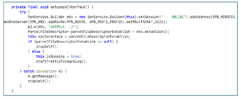In addition to traffic interception, this design can have a secondary defensive impact against security tooling. By controlling or disrupting outbound connectivity, the VPN layer can interfere with cloud-based verification services such as Google Play Protect and other security APIs that rely on network access for reputation checks. In practice, this can reduce the effectiveness of real-time scanning, delay cloud-assisted detection, and, in some cases, allow malicious components to be installed or executed with reduced scrutiny when external validation channels are weakened or blocked.