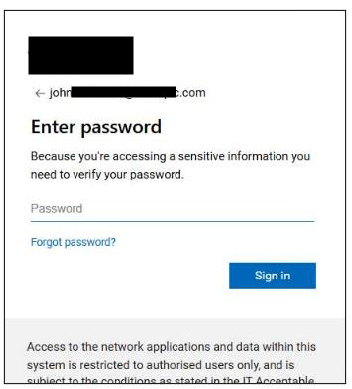 Following the authentication state, the page presents a Microsoft-style password prompt. The interface closely mirrors a legitimate organizational login page, including: