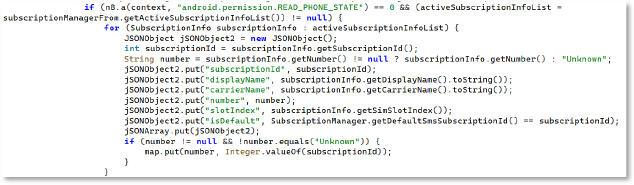 It uses SubscriptionManager APIs to gather SIM information such as the subscription ID, display name, carrier name, phone number, SIM slot index, and whether it is the default SIM. The data is then structured into JSON objects. With this information, the attacker can issue commands targeting a specific SIM—for example, sending SMS messages or running ussd through a chosen SIM on dual-SIM devices.