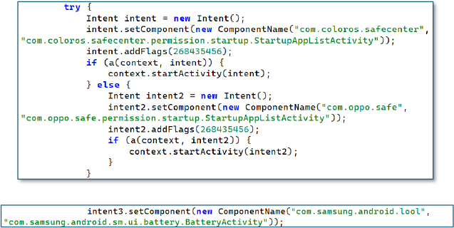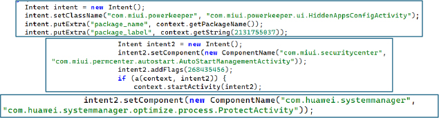 The malware tries to gain auto-startup permissions by opening MIUI Powerkeeper settings (HiddenAppsConfigActivity or AutoStartManagementActivity) on Xiaomi/Mi/Redmi devices. The malware tries both activities to ensure it is granted auto-start privileges, ensuring persistence even after a device reboot.